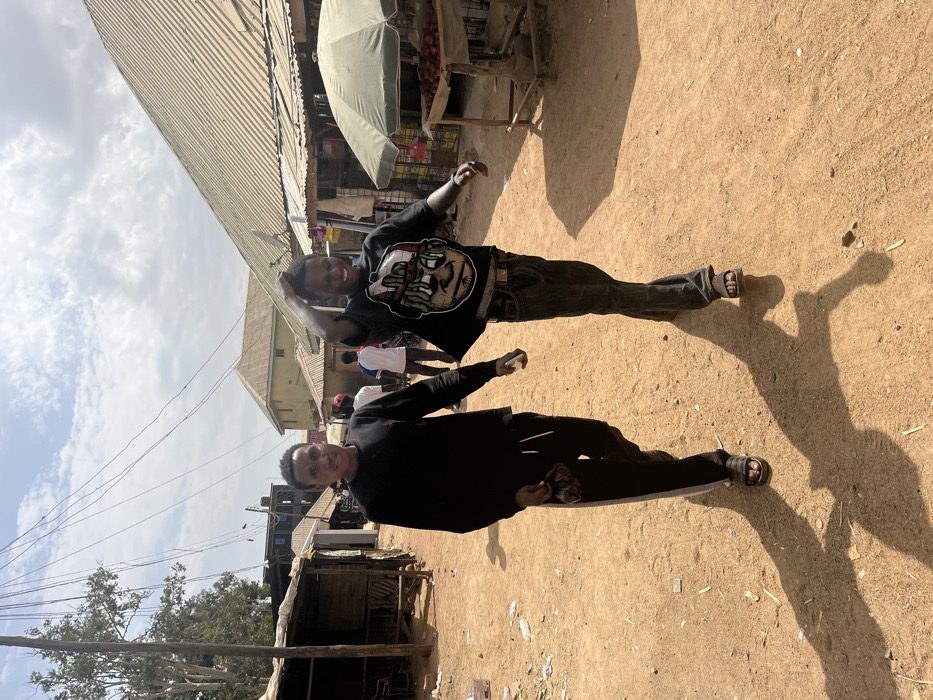 The image depicts an unpaved market street in Rafin Par, Nigeria, under a bright, partly cloudy sky. Two young adult males walk towards the camera along a reddish-brown dirt road. The individual on the left wears a black long-sleeved shirt, black sweatpants with white side stripes, and dark sandals, holding a small dark object in his left hand while looking directly forward. The individual on the right wears a black t-shirt featuring a cartoon graphic, dark jeans, and light-colored sandals; he is smiling, looking forward, and has his right hand raised to his head. Long shadows are cast on the ground to their right. On the left side of the street, makeshift market stalls with wooden frames and various coverings are visible, alongside a wooden utility pole with numerous overhead wires. Further back on the left, multi-story buildings with light-colored facades are present amidst sparse green foliage. On the right side of the street, more market stalls with corrugated metal roofs line the road. One stall in the mid-ground features a light-colored umbrella shading a display of red produce, likely tomatoes, on a wooden stand. Several other people are visible in the background, walking away from the camera. The ground is littered with small pieces of debris, including plastic bags.