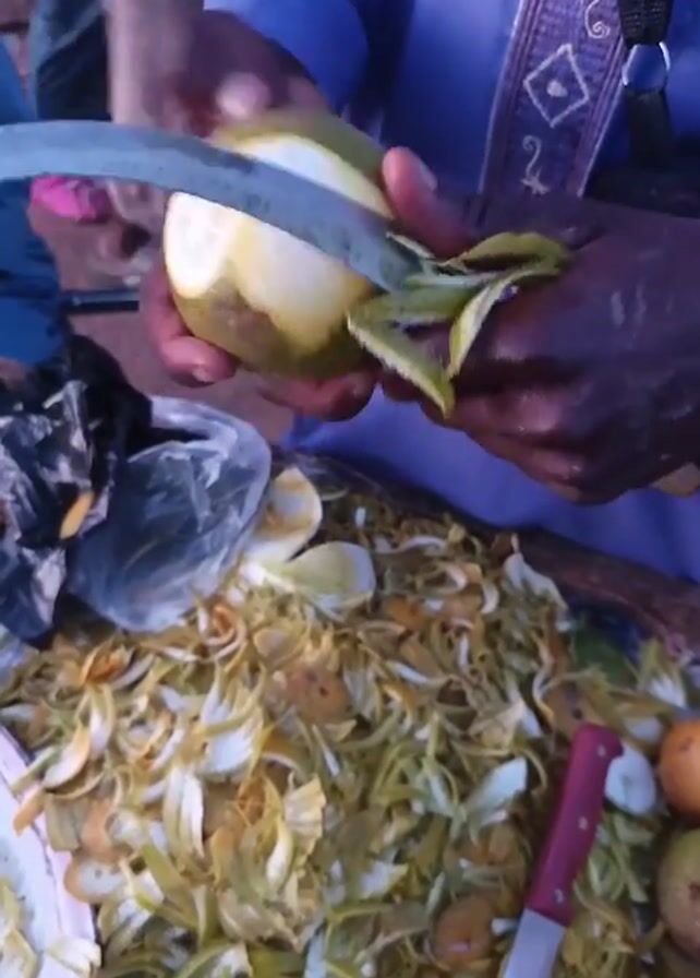 A person is peeling a citrus fruit with a knife, holding it in both hands over a pile of peels. The person wears a blue shirt with patterned trim. The peels are mostly light green and yellow. A knife with a red handle lies on the pile. The background includes more fruit, trash, and a sandy ground.