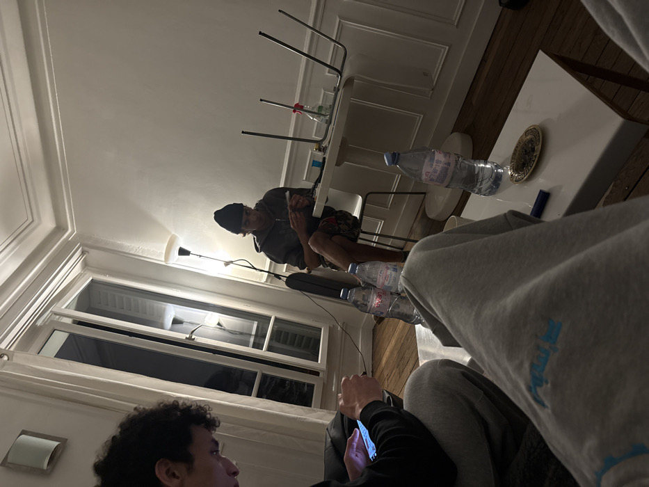 The scene depicts the interior of a room, consistent with a Parisian apartment due to its high ceilings, ornate crown molding, white wainscoted walls, and large French windows. The floor is hardwood. The room is dimly lit by a floor lamp and a wall sconce. Three individuals are present or implied. In the midground, a male subject, dressed in a dark beanie, a dark hooded sweatshirt, and patterned shorts, is seated on a white chair at a small white table. He is engaged in rolling a substance with both hands. On the table near him are small containers and a clear spray bottle. Two metal-framed chairs are inverted and resting on this table. In the left foreground, the lower body and arms of a second subject are visible, wearing light grey sweatpants with blue script. This subject is holding and operating a smartphone. On a white coffee table in front of this individual, an Evian water bottle, a blue lighter, and an ornate ashtray containing ash and dried plant material are present. Additional Evian bottles are visible nearby. The photograph's perspective suggests a third individual is observing the scene. The large French windows are open, revealing a dark exterior with a reflection of an interior light source.