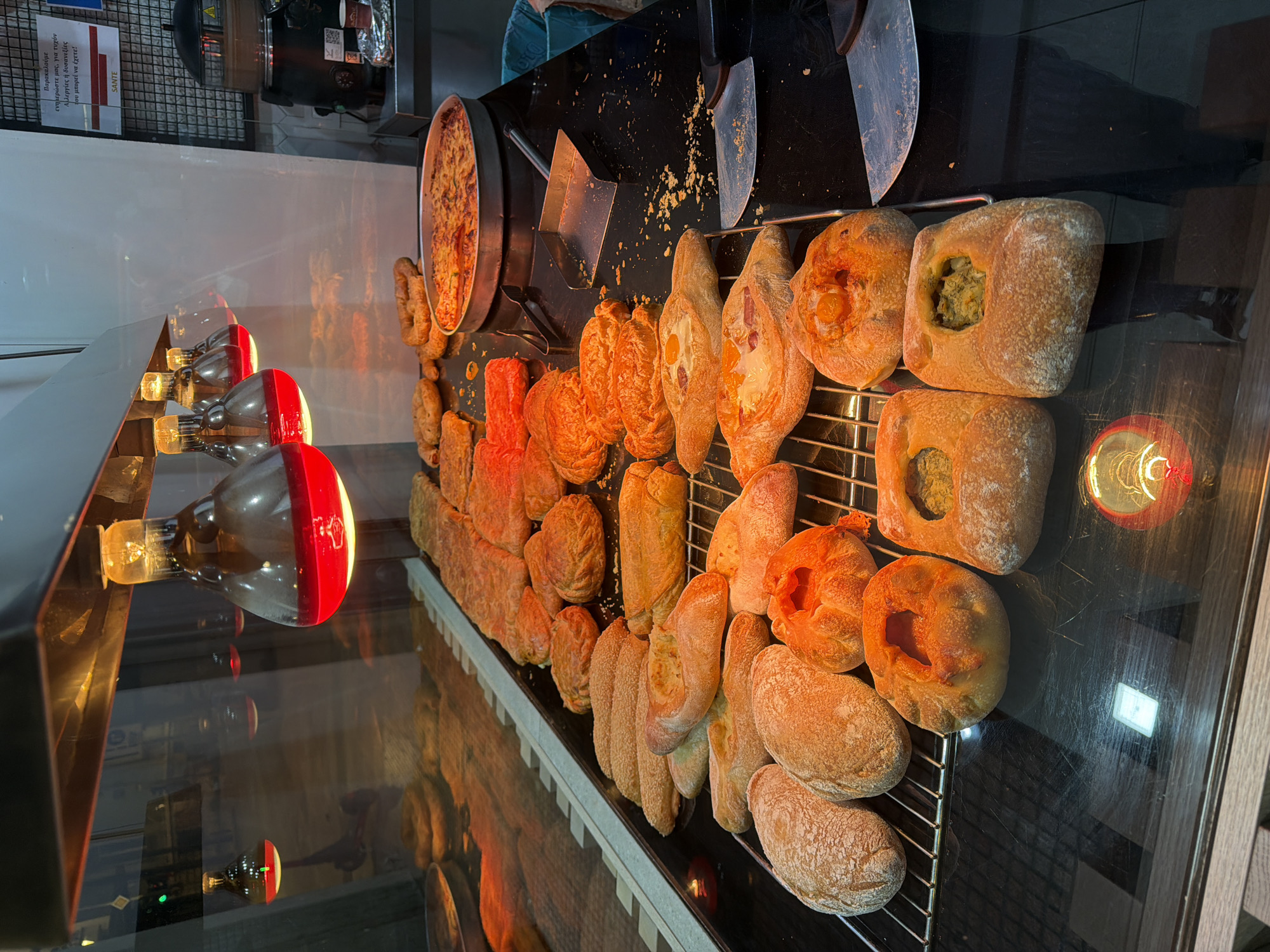 Here is a forensic description of the image: **General Impression:** The image depicts a display case filled with a variety of baked goods, likely in a bakery or restaurant setting. The lighting is warm, and the baked goods appear fresh and appetizing. **Location:** The presence of a sign written in Greek suggests the location is in Greece, likely in Athens given the general context. The sign reads “Παρακαλούμε ενημερώστε μας, για τυχόν Αλεργίες ή δυσανεξίες που μπορεί να έχετε!”, and it seems to be from a cafe called "SANTE". **Objects:** * **Baked Goods:** A wide assortment of bread, rolls, and pastries are displayed. Some appear to be savory items filled with meat or vegetables, while others are sweet. There is also a large pizza. * **Display Case:** The baked goods are arranged in a refrigerated display case with a glass front. * **Tools:** Various spatulas and knives are above the display. * **Heating Lamps:** Red lamps hang above the food. * **Signage:** A sign in Greek is visible. **Environment:** * The area appears clean and well-maintained. * The backdrop behind the display case is dark and possibly made of black painted wood. * The glass front of the display case reflects the baked goods and the surrounding environment. **People and Interactions:** There is no evidence of the presence of people.