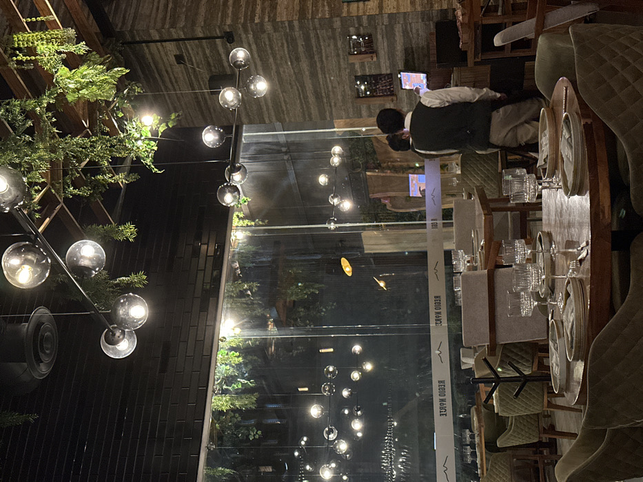 An indoor restaurant scene features a long, elegantly set table with glassware and plates. A couple is visible in the background, seated at a table looking at screens. Decorative lighting fixtures, including hanging orbs, add ambiance, and greenery is seen hanging in the foreground. Large windows offer a view to the outdoors, with reflections and additional hanging lights visible in the glass. The overall impression is one of modern sophistication.