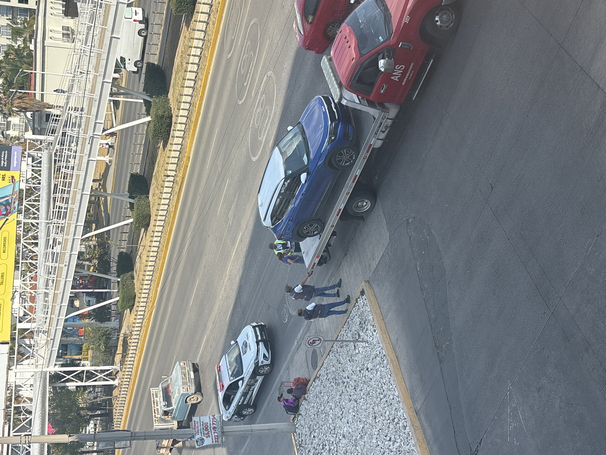 This image depicts an urban street scene in San Bernardino Tlaxcalancingo, Mexico, showing an apparent vehicle recovery or traffic incident. In the foreground, a paved area with a small white gravel planter is visible. Two individuals are seated on the ground adjacent to a metal signpost bearing a "No Entry" or "No Parking" symbol. A white traffic patrol sedan, marked "PROXIMIDAD VIAL" with active red and blue emergency lights, is parked on the street beside them. Further down the street, an older light-blue pickup truck is visible, towing a small trailer. A large, partially obscured commercial sign with "PREMIUM" and a phone number "222 749 7794" is attached to a pole on the far left. The midground features a multi-lane asphalt roadway with painted lane markings and indistinct speed limit symbols on the pavement. A red flatbed tow truck, displaying "ANS" and the number "207" on its side, is positioned in one lane. A blue Kia Seltos SUV is loaded onto the flatbed of the tow truck. Three individuals are standing near the tow truck: two men in dark vests and light shirts are positioned near the front of the blue SUV, while a third person in a yellow-green reflective vest stands near the rear of the SUV on the tow truck's bed. A red sedan is partially visible stopped behind the tow truck. In the background, a white pedestrian overpass spans the road, with at least two individuals visible walking on it. Beyond the overpass, a median or roadside area features short yellow bollards connected by a rail and some shrubbery. Various urban buildings, including some multi-story structures, line the street, along with several trees and large advertising billboards above the overpass. A white commercial van is visible driving on the opposite side of the road beneath the overpass. The scene is illuminated by daylight under clear conditions, casting shadows to the right.