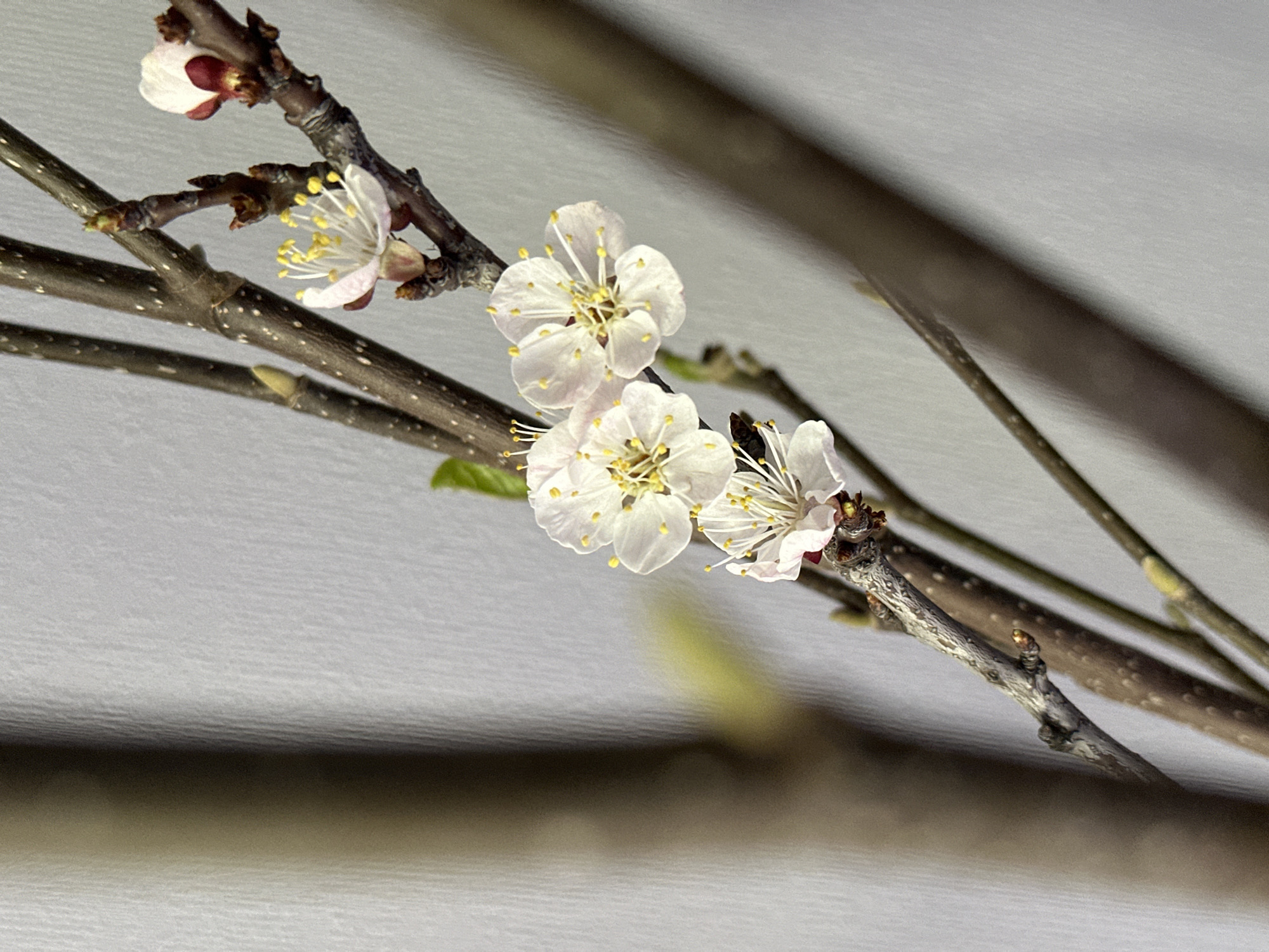 The image displays a close-up of several flowering branches, identified as occurring in Kazan, Russia. Three fully bloomed flowers, likely from an apricot or plum tree, are prominently featured in the central foreground. Each flower exhibits five delicate white to pale pink petals and numerous bright yellow stamens with small, dark anthers. Further to the upper right, a single partially open bud reveals reddish-brown sepals and emerging white petals. The branches are thin, brown, and irregularly textured with small speckles, showing nascent green leaf buds on some sections. Other blurred branches are visible in the foreground and background, creating depth. The scene is set against a uniform, light-colored background with a subtle vertical textured pattern. No individuals, overt actions, or interactions are present.
