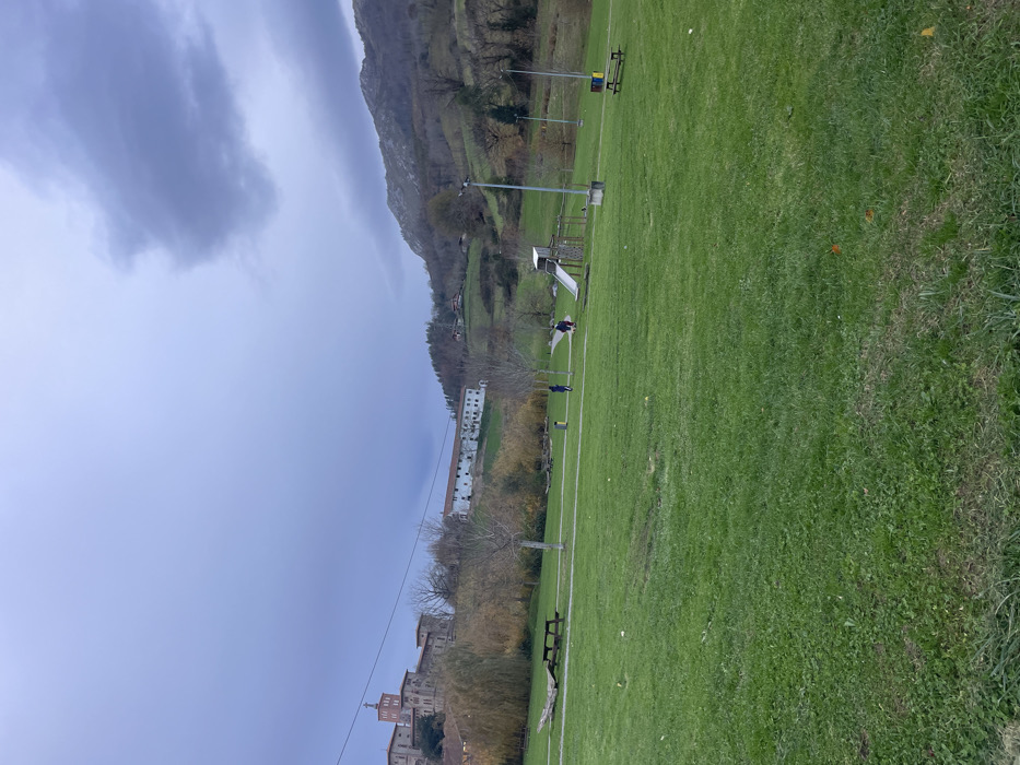 A landscape features a lush green field with a few benches, interspersed with sparse foliage. A simple playground slide is also present. A building stands nearby, with what appears to be a monastery complex situated near the field. A prominent mountain rises in the backdrop, partially veiled by a cloudy sky, indicating an overcast day.