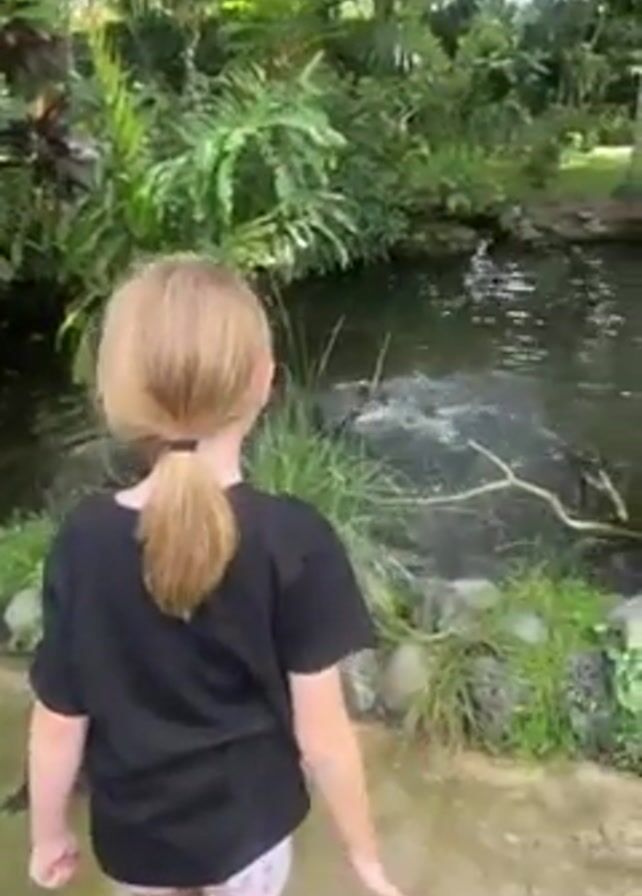 A young girl with blonde hair pulled back in a ponytail stands facing a pond surrounded by lush greenery. She is wearing a black t-shirt and patterned shorts. She points towards the water where dark-colored birds are swimming. The pond is partly surrounded by rocks and vegetation. A black dog is partially visible in the lower left corner of the frame. The scene is outdoors, with dappled sunlight filtering through the trees. The girl throws something into the pond, causing a splash.