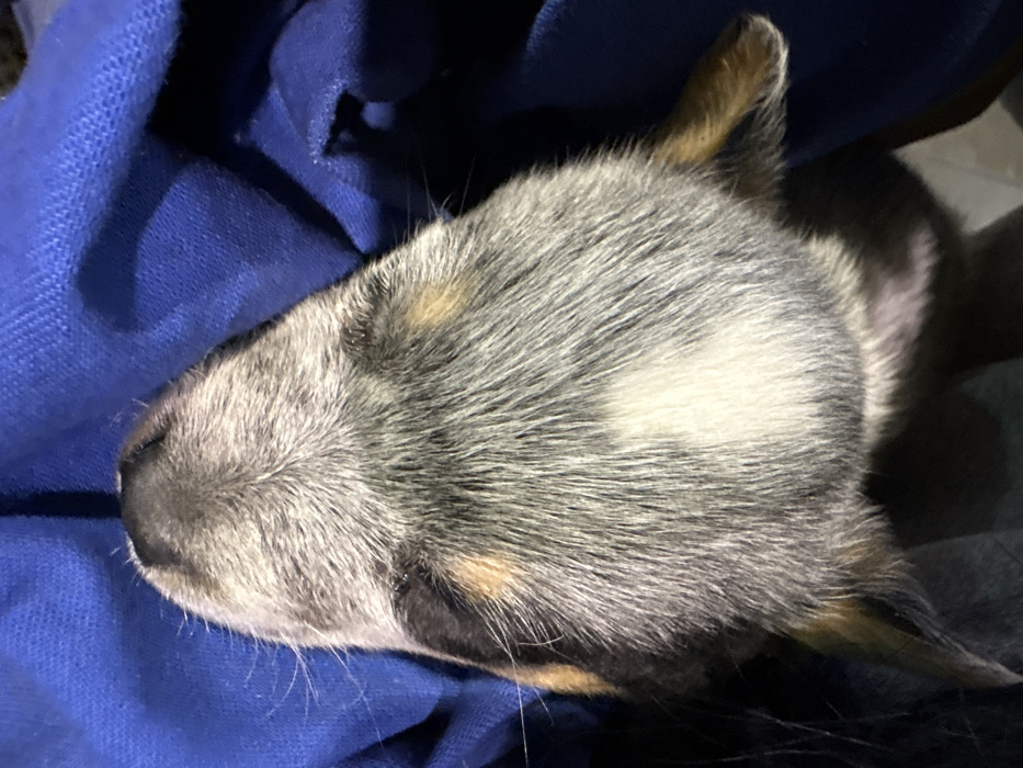 A close-up, overhead perspective captures a juvenile canine, identified as a puppy, resting on a textured blue fabric surface. The animal exhibits a blue-grey roan coat with a prominent white blaze extending down its forehead. Tan markings are visible superior to its closed eyelids and on the inner aspect of its ears. Its muzzle is dark grey to black, and the nose appears dark. The puppy's eyes are closed, indicating a state of repose. No visible interaction or action is occurring beyond the state of rest. The background is indistinctly dark. The location is Ball Ground, United States.