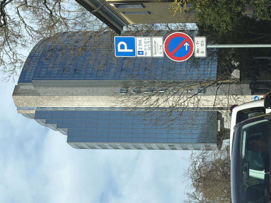 The image depicts an urban street scene in Neu-Ulm, Germany, centered on the modern, multi-story Neu-Ulm City Hall (Rathaus Neu-Ulm), located at Marienstraße 1. The building features a prominent blue glass facade with a distinctive curved, stepped design on its left side and a central vertical column of light-colored stone or concrete. Bare deciduous trees with visible branches are present in the foreground and mid-ground, suggesting a late winter or early spring season. In the mid-ground, to the right of the central building, a pole displays two stacked German traffic signs. The upper sign is a blue 'P' indicating a 2-hour parking limit from Monday to Friday (9 AM - 8 PM) and Saturday (9 AM - 6 PM), with an exemption for residents ("Bewohner frei"). The lower sign is a 'No Stopping' (Haltverbot) sign, a red circle with a blue field and white diagonal slash, which includes a white right-pointing arrow indicating the restriction applies in that direction from the sign, specifically from Monday to Friday (8 AM - 12 PM). To the far right, part of a light-colored building with a pitched roof is visible, partially obscured by the signs and some green foliage. The photograph is taken from inside a dark-colored vehicle, with the top of its dashboard visible in the lower left. A person wearing a light-colored head covering is faintly visible in the driver's seat. A section of a white vehicle is also visible behind and to the right of the dark vehicle. The sky above is partially cloudy blue, indicating daylight conditions.