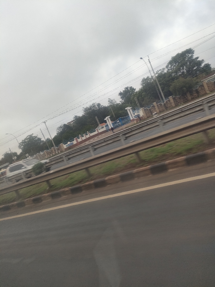 The image displays an exterior scene from a slightly elevated, tilted perspective, depicting a multi-lane road environment under an overcast sky. In the foreground, the edge of an asphalt road is visible, marked by a solid yellow line. A silver-colored metal guardrail separates this foreground road from a lower, multi-lane highway. Beyond the guardrail, a grassy median strip with black curbstones is present. On the far side of the distant highway, a light-colored SUV, possibly white or silver, is visible on the shoulder or a slow lane, oriented towards the left. Further back, a beige or light brown stone wall with white coping extends horizontally, enclosing a property. A prominent decorative entrance structure with two tall white pillars and a blue archway or gate is situated in the center-right background, seemingly the entrance to the enclosed property. Two indistinct human figures are visible near this entrance; one appears to be walking towards it from the right, and the other is near the entrance itself. Numerous green trees form a dense treeline behind the wall and entrance. Utility poles with overhead wires and streetlights are interspersed throughout the scene, particularly above the distant highway. The location is observed to be within Gatongora ward, Kenya.