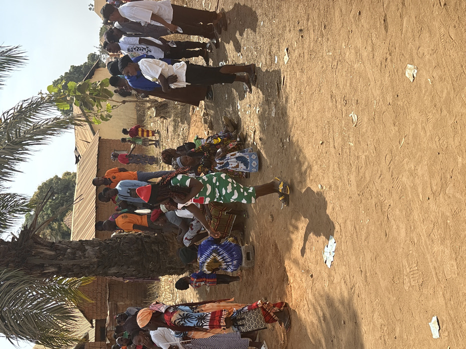 An outdoor gathering of people, mostly seated or kneeling on the ground, appears to be in progress. Adults and children are present, with attire ranging from casual to traditional African patterns. Some individuals wear t-shirts and Western clothing. A palm tree stands to the left, and a dirt ground surrounds the gathering. Buildings are visible in the background, indicating a village or rural setting. The lighting suggests it's daytime.