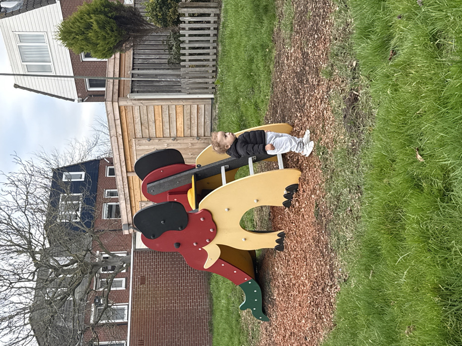 The image depicts an outdoor playground in a residential area of Almere, Netherlands, under an overcast sky. A single young child, with light brown curly hair, is visible standing upright on a ground surface of reddish-brown wood chips. The child wears a black puffer jacket, light grey pants, and white sneakers, and faces towards the right side of the frame. Adjacent to the child is a colorful playground slide. The slide is designed to resemble a stylized animal, predominantly red on the upper slide portion with white or yellow polka dots, and supported by yellow arched structures that form its base. A green section with white or yellow dots forms the lower part of the slide's end. A yellow platform is visible at the top of the slide's ladder, which has dark-colored supports. The wood chip area is surrounded by green grass. In the background, multiple residential structures are visible. To the left, a red brick building with a dark blue or grey sloped roof and multiple windows is partially obscured by a large, bare-branched deciduous tree. To the right, another residential building with a white upper facade and a red brick base is visible. Between the playground and the right-side buildings are a light-colored wooden shed with horizontal paneling, a dark wooden picket fence, and a small green coniferous shrub.