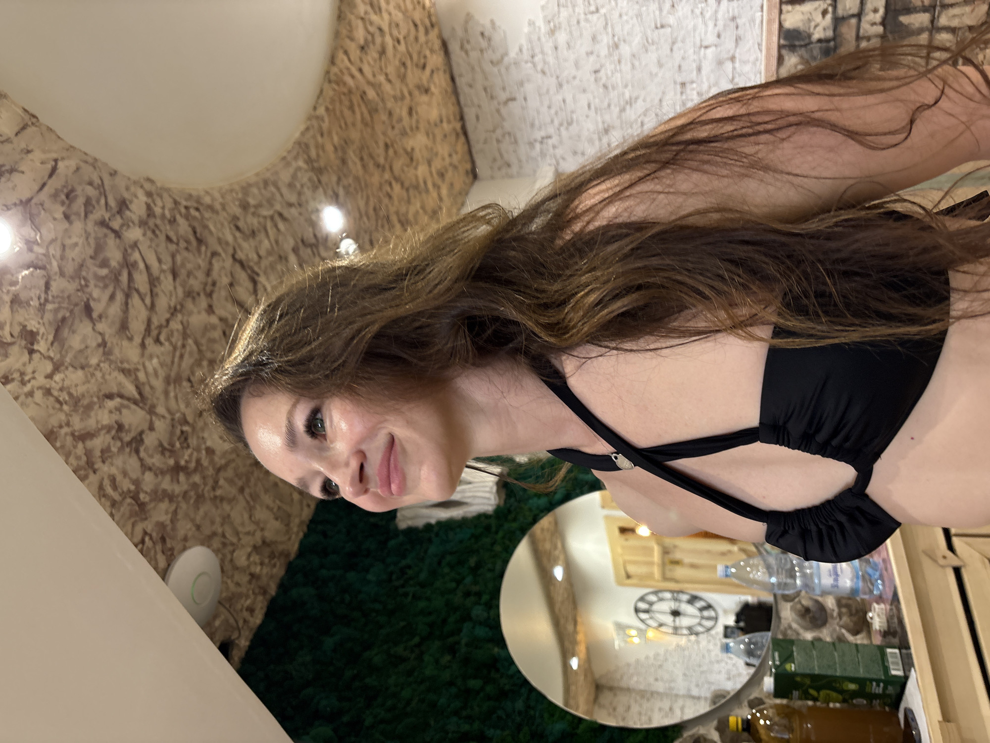 A female subject is depicted indoors, in what appears to be a commercial or leisure facility located in Bely Klyuch, Russia. The subject is a woman with long, wavy, dark brown hair, visible from the upper chest upwards. She is wearing a black halter-neck top. Her head is turned slightly to the left and tilted upward, revealing a subtle smile on her face and her eyes gazing upward and to the left. A small, circular silver pendant is visible on a thin chain around her neck. The background features a textured interior design. The ceiling exhibits a light brown, possibly cork-like, rough-textured surface with multiple recessed circular light fixtures and a larger, smooth white oval or dome element. A white, circular device with a green illuminated ring, consistent with a Wi-Fi access point, is mounted on the ceiling in the upper left quadrant. The wall to the subject's left is covered with a dark green, textured material resembling preserved moss. A large, circular mirror is affixed to this wall, reflecting parts of the room behind the subject. The reflection in the mirror shows a rustic-style brick wall, a large circular clock with Roman numerals and exposed gears, and a wooden counter beneath. On this counter, several items are visible: a dark brown bottle containing a light brown liquid, a green cardboard carton, and two clear plastic water bottles, one of which is labeled "Snezhnaya." The wall to the subject's right, partially visible, also appears to be constructed from light-colored, textured bricks or tiles. The lighting is artificial and evenly distributed throughout the scene.