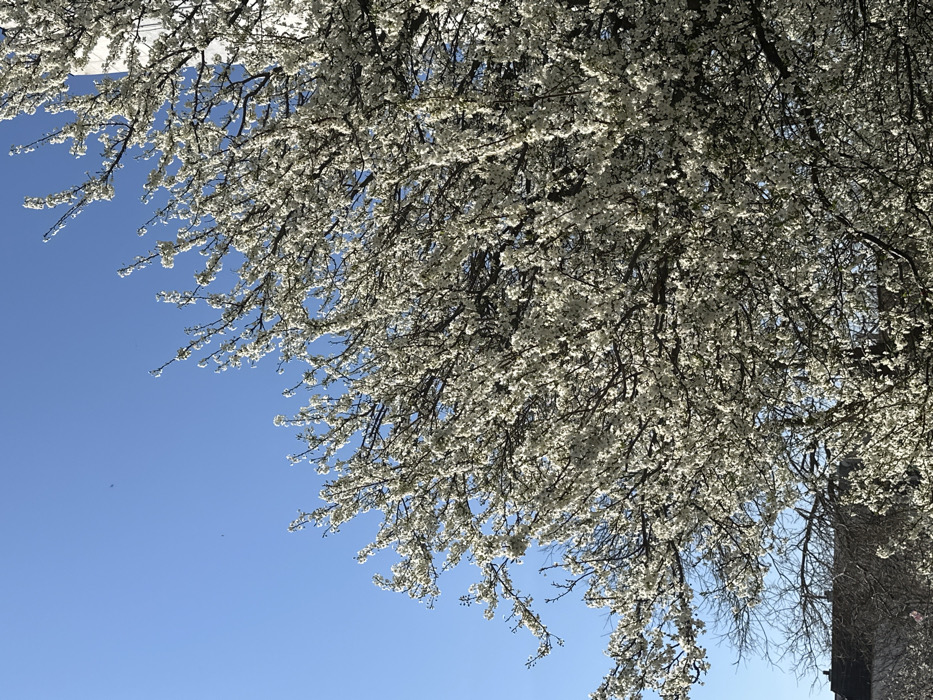 The image presents a vibrant outdoor scene, primarily featuring a deciduous tree in full bloom, densely covered with small white flowers
