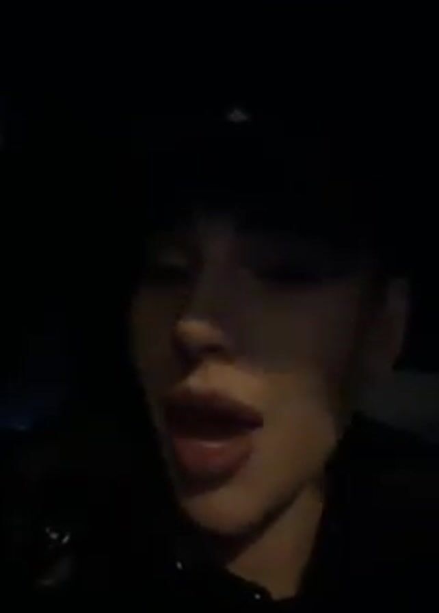 A close-up video shows a person with fair skin and dark hair wearing a black baseball cap. The person is looking directly at the camera with red lipstick on. Loud music plays in the background.