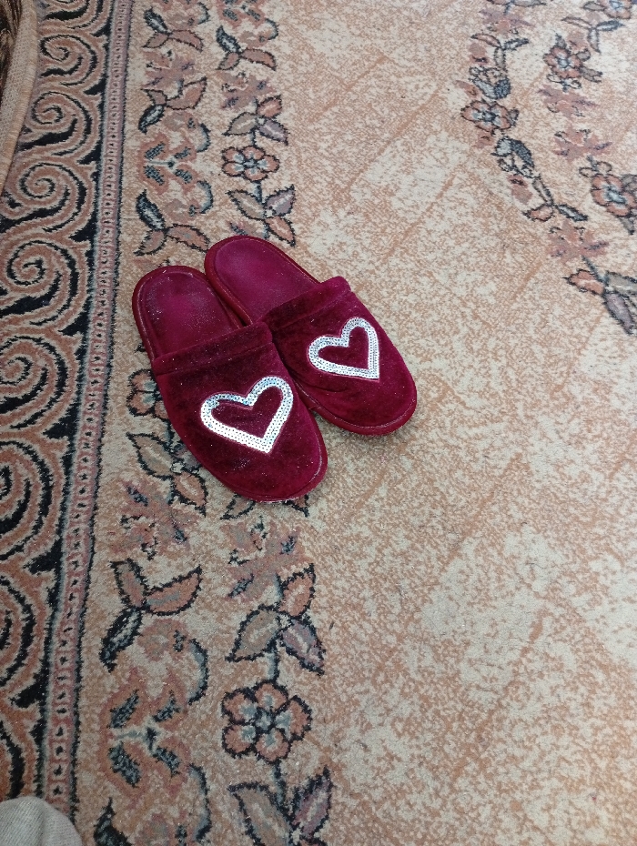 - "A pair of dark red, plush slippers, each adorned with a silver-sequined heart outline on the toe, rests on a patterned floor rug" by FM-tIMEp2, licensed under CC BY 4.0