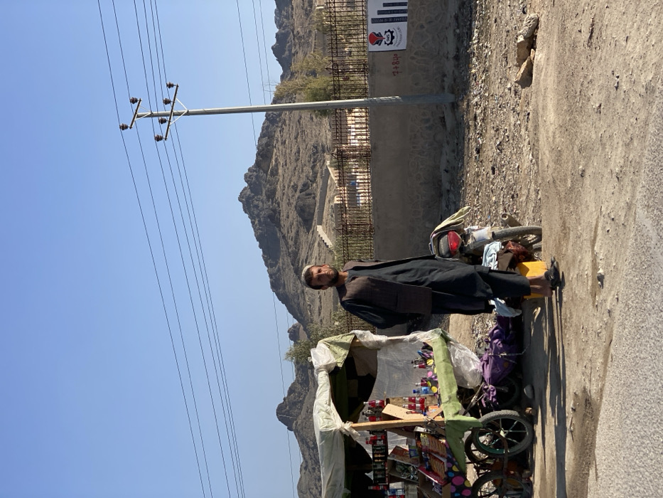 A male individual stands on a dusty, unpaved road shoulder in Kokaran, Afghanistan, facing slightly right and looking towards the viewer. He wears a dark long-sleeved garment, a dark brown sleeveless vest, and a white skullcap (taqiyah). His hands are clasped behind his back, and he wears dark open-toed sandals. To his left is a two-wheeled vendor cart with a makeshift light-colored canopy and a dark green fabric covering. The cart displays numerous brightly colored bottled beverages and packaged snacks on wooden shelving. Behind the man, to the right of the cart, is a silver-colored scooter or small motorcycle with a red taillight, draped with fabric. The ground consists of dirt and gravel, with a few small dark spots possibly indicating moisture. In the midground, a low concrete wall topped with a dark metal fence separates the immediate area from distant features. Sparse vegetation is visible behind the fence. A tall, light-colored utility pole with multiple cross-arms supporting several power lines stands to the right of the man, affixed with a poster displaying text and graphics, including "7 + 840" and a "CNC" logo. The distant background is dominated by arid, rocky mountains under a clear blue sky. Terraced structures or steps are visible on one of the mountain slopes.