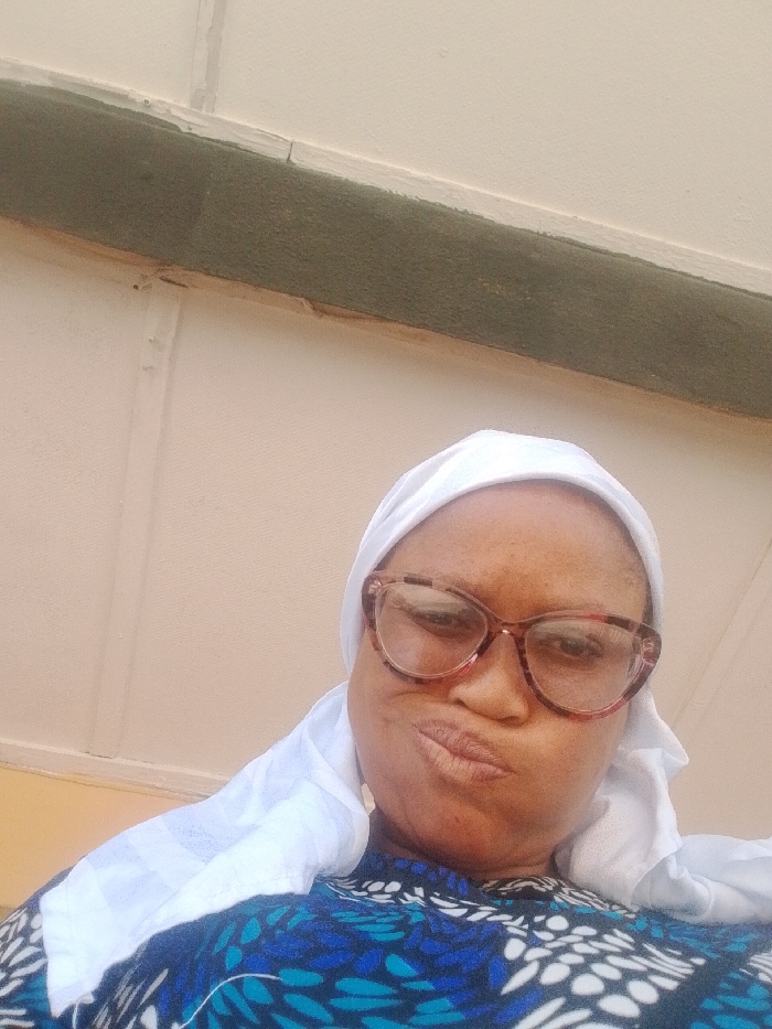 This image depicts a close-up, slightly low-angle portrait of an individual in Agani, Nigeria. The subject is an adult female with brown skin, wearing a white head covering that drapes over her head and shoulders. She wears prescription glasses with brown and pink tortoiseshell-patterned frames. Her mouth is pursed, and her eyes are directed towards the camera. She is clad in a garment featuring a blue, teal, and white abstract or floral pattern. The background consists of a light beige or cream-colored wall, with a dark green, textured horizontal beam or ledge positioned above the subject's head. Above this beam, another section of the light-colored wall is visible. No other individuals or significant objects are present.