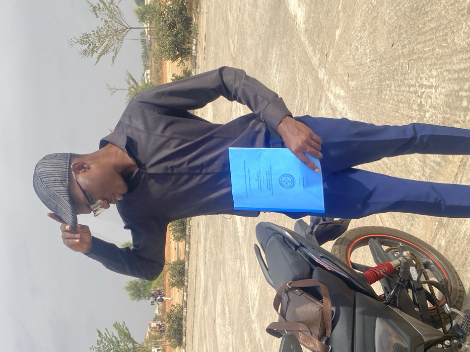 A full-length outdoor photograph captures a dark-complexioned male subject standing on a light grey paved surface under a clear, bright sky. He wears a long-sleeved black collared shirt, navy blue trousers, clear-framed glasses, and a grey striped flat cap, which he adjusts with his raised right hand. In his left hand, he holds a light blue bound document, appearing to be a thesis or official report, with visible text and a circular emblem on its cover. He is oriented slightly to his right. To his left, a black motorcycle with red rear suspension and orange wheel accents is parked, with a brown leather shoulder bag resting on its seat. The background features sparse small trees, low-lying shrubs, and distant low-rise buildings, with a few indistinct figures visible in the far distance. The scene is located in Unknown, Nigeria.