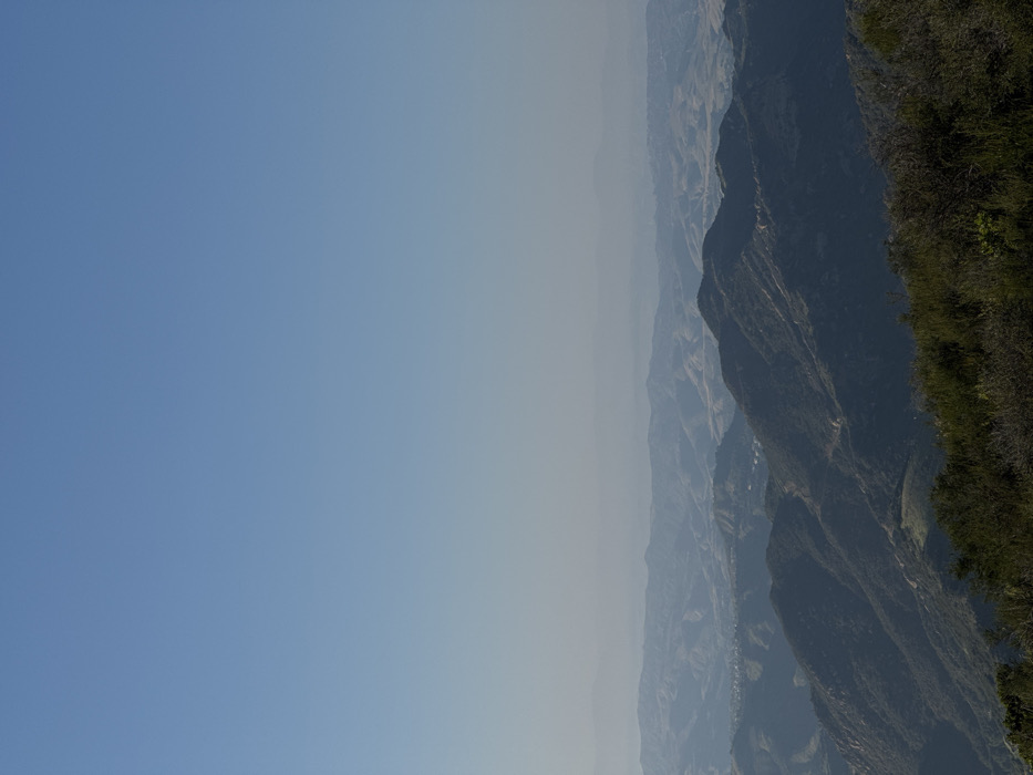 An elevated landscape photograph depicts a panoramic view of the Unincorporated Santa Monica Mountains, United States of America, under a clear, hazy blue sky. The upper two-thirds of the image features an unobstructed sky, transitioning from a deeper blue at the zenith to a lighter, more desaturated blue closer to the horizon line, indicative of atmospheric haze. The horizon reveals multiple undulating mountain ranges, progressively lighter and more indistinct with distance due to atmospheric effects. In the mid-ground, darker, vegetated mountain ridges are visible, displaying deep shadows on their slopes from a high-angle sun. Sparse, light-colored structures or developments are discernible within valleys and on distant hillsides. The immediate foreground shows the tops of dense, dark green scrub brush and chaparral, suggesting the viewpoint is from a vegetated elevated position. No individuals, animals, or specific human activities are present in the frame.