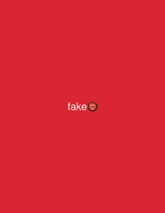 The image displays a solid, monochromatic red background. Centered horizontally and slightly above the vertical midpoint, white sans-serif text reads "fake," immediately followed by a Japanese Ogre (Oni) emoji, depicted as a red face with prominent fangs and horns. No individuals, physical objects beyond the digital text and emoji, or discernible actions or interactions are present. The environment is entirely digital. No visual elements within the image content provide specific geographical or architectural information to identify a location within the city of Lipomo, Italy.