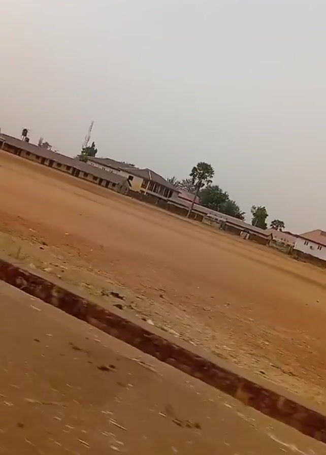 roadside view in a rural area. A dirt field is visible, with a signpost near the road and a building in the background. The sky is overcast. A man walks across the foreground from left to right. The field transitions from bare dirt and debris to overgrown grass as the view moves further into the field. The road is made of a dark, possibly paved material, and appears to be slightly elevated in relation to the field.