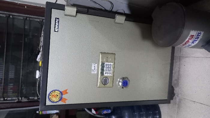 - "A light grey Krissbow brand safe with a dark grey frame occupies the center of the image, resting on a light-colored tiled floor" by FM-FrMp53, licensed under CC BY 4.0