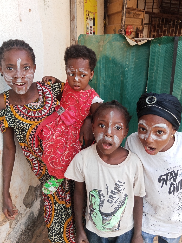Four young African girls pose outdoors, their faces adorned with white paint