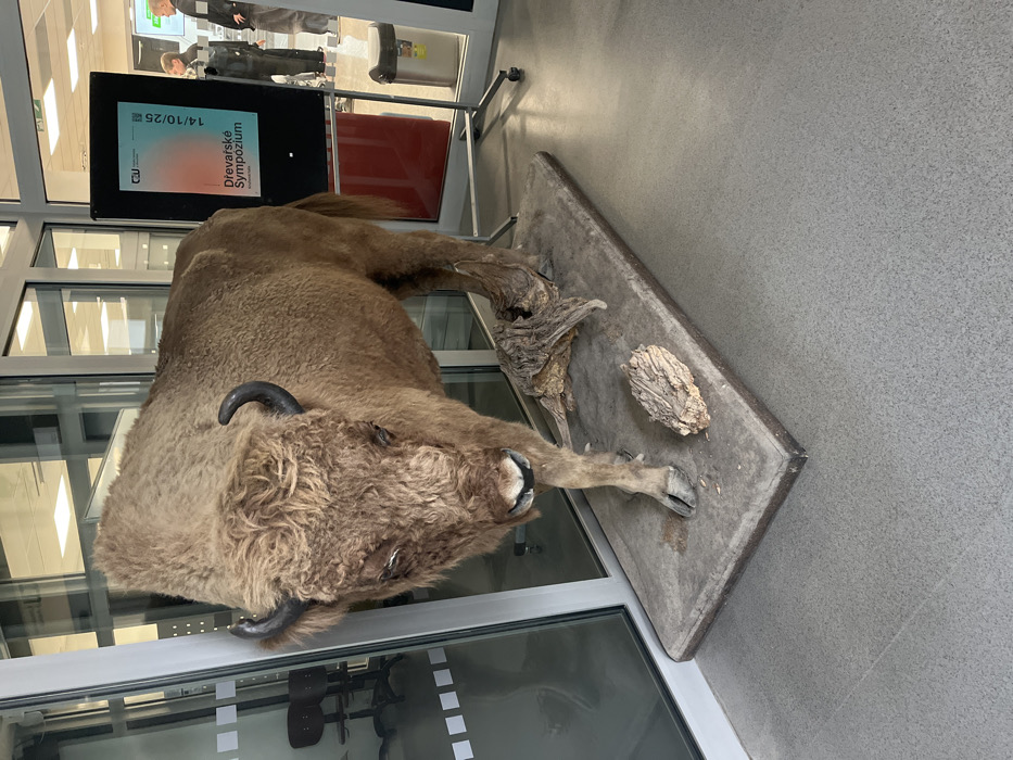 An indoor, well-lit scene depicts a taxidermied European bison mounted on an elevated, rectangular gray platform. The bison, light brown with dark horns, is positioned in a static walking stance. Small wooden fragments are scattered on the platform near its front hooves, and a larger piece of driftwood rests beneath its belly. The environment features light gray speckled flooring and extensive glass wall partitions. To the right of the bison, a black vertical display board exhibits text including "ČZU," "14/10/25," and "Dřevařské Sympozium," indicating the location is the Czech University of Life Sciences Prague (Česká zemědělská univerzita v Praze) in Prague, Czechia. Two indistinct male figures are visible in the blurry background beyond the display board, and a gray trash receptacle is also present. Dark office chairs are partially visible through the glass on the left.