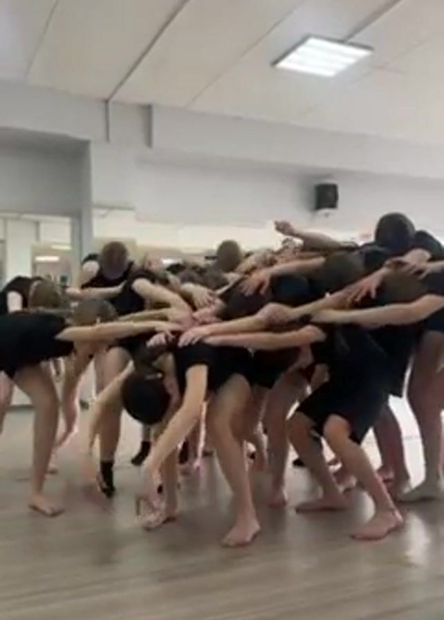 A group of about 15 young people in a dance studio are performing a choreographed movement
