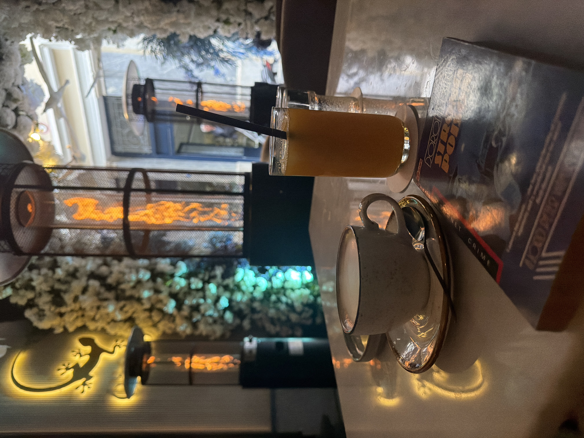 The scene is set at a cafe in Athens, Greece. A table is occupied with a cup of coffee on a saucer with a spoon, a glass of orange juice with a black straw, and a book titled "DOPORO STREET CRIME." In the background, one can see a decorative installation of a gecko illuminated in gold, and outdoor heating elements with decorative flower arrangements, implying the outdoor setting of a terrace or patio. The cafe is near a window, as inferred from the light and shapes visible outside. The objects are situated to suggest someone is enjoying a beverage while possibly reading.