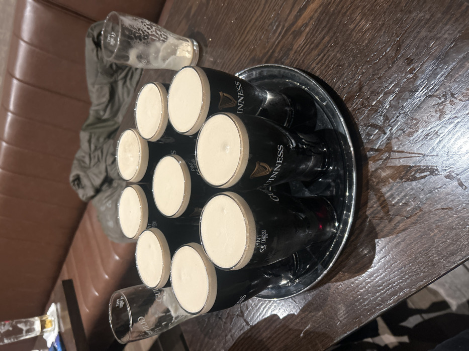 A silver tray laden with full pints of Guinness sits on a dark wooden table