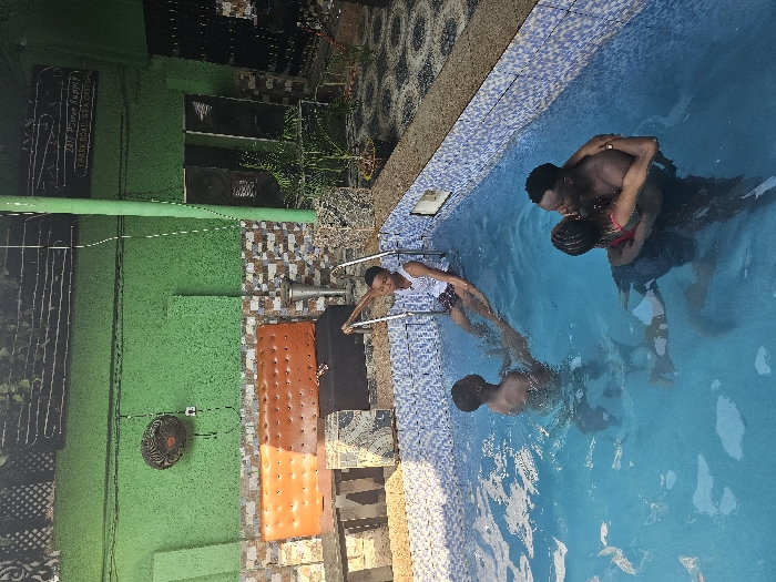 The image displays an outdoor swimming pool area, located in what is described as the city of Asaba, Nigeria, although overhead signage within the scene references "1 PARK ROAD, GRA ONITSHA