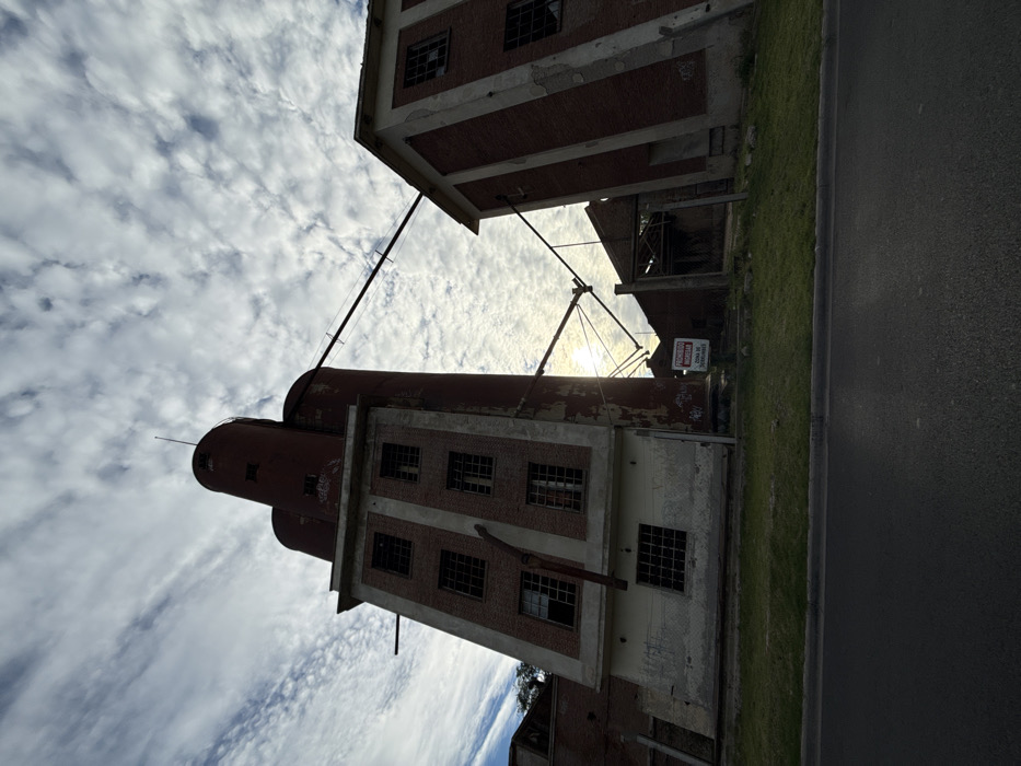 The image displays a derelict industrial complex located in Santa Rosa, Argentina, viewed from a low angle under a partly cloudy sky