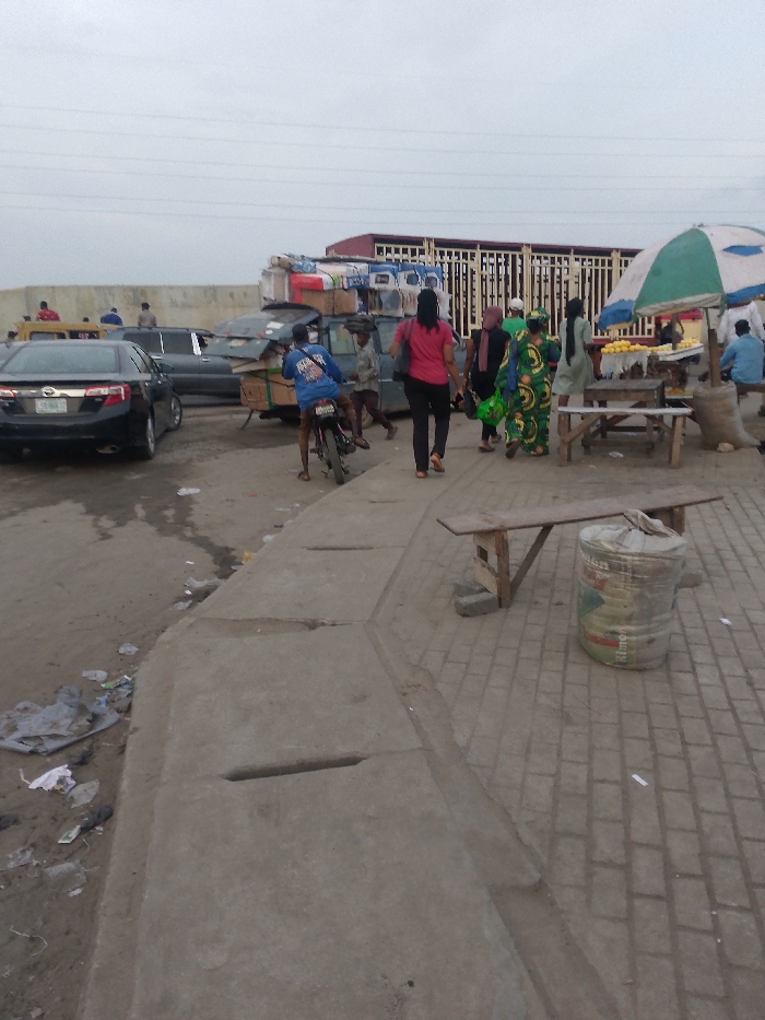 A bustling street scene under a grey sky features cars, a truck overloaded with goods, and pedestrians. A motorcyclist is near the truck. Several women in colorful clothing walk past a fruit vendor selling under a green and white umbrella. A bench and a large sack sit on a paved area. Litter is scattered along the curb of a concrete drainage channel. The atmosphere suggests a busy marketplace in an urban setting.