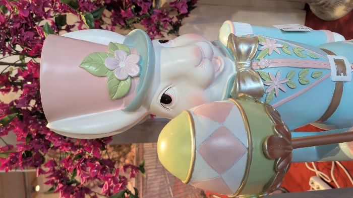 This image displays a large, decorative anthropomorphic rabbit figurine, positioned within a retail or display environment in Roermond, Netherlands