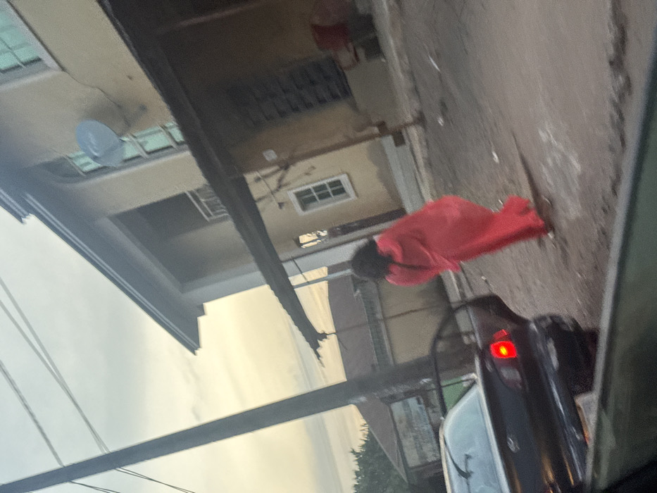 A street-level, angled shot shows a person on the ground covered in a red cloth or blanket, potentially sleeping or resting near the sidewalk. The scene includes a car with a visible tail light and what appears to be the reflection of other vehicles in the windshield. Buildings are visible in the background, with details such as windows and a satellite dish on the side of one. There are power lines visible against the sky.