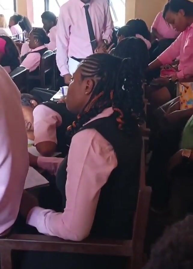classroom filled with students, most of whom are wearing pink shirts and black vests. A man in a similar outfit stands near a large window, seemingly monitoring the class. The students are seated at wooden desks, some writing in notebooks. A few other people wearing the same attire can be seen in the background, suggesting a uniform. The room is well-lit, and the overall atmosphere appears to be of a formal or academic setting.