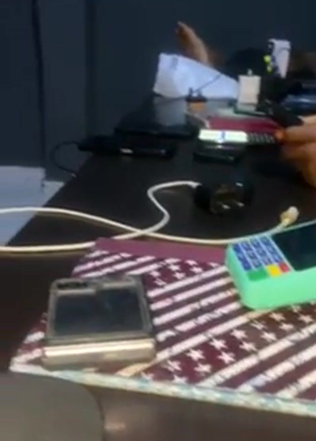 The camera pans around a room with a dark table covered in electronics including chargers, a cellphone, a green calculator, and a small vintage camera
