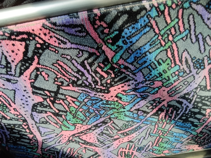 The scene, located in East Los Angeles, United States, displays a close-up of a multi-colored, abstractly patterned textile. The fabric, likely upholstery, features interwoven linear and irregular shapes in pink, purple, light blue, teal, and black against a dark grey base. The textile exhibits a textured, woven surface. A horizontal, cylindrical metallic bar, silver in color, is positioned across the upper portion of the frame. No persons, specific actions, or interactions are discernible. The overall appearance is consistent with public transportation seating material.
