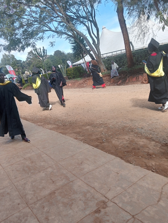 Graduates in black gowns and caps walk along a dirt path. Some have yellow stoles. Behind them, a large white tent-like structure is visible. In the background, greenery, including trees and shrubs, populates the scenery. A few individuals are seated nearby. The day appears bright with a clear sky. A sidewalk is present in the foreground.