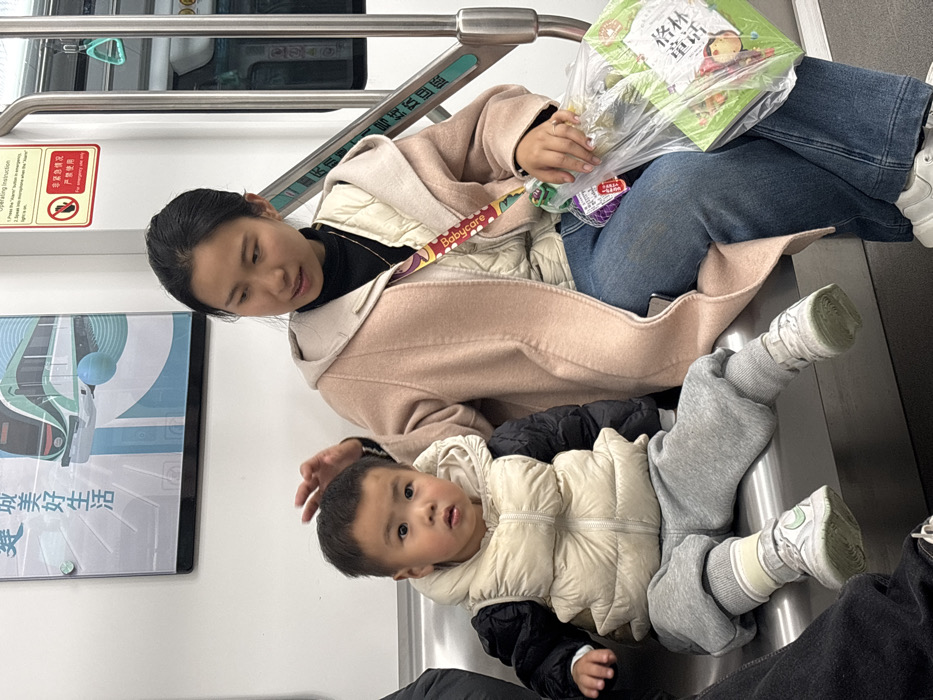 - "Inside a subway car in Banan, China, an adult female and a young child are seated on a polished stainless steel bench" by FM-hd42B3, licensed under CC BY 4.0