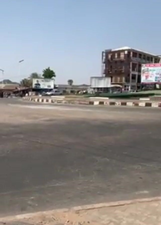 roundabout on a clear, sunny day. A motorcycle with two people on it enters from the right and drives around the roundabout. Next, a red compact car enters from the right and also drives around the roundabout. Finally, a silver sedan enters from the right and proceeds around the roundabout. In the background is a multi-story building with scaffolding on one side and a large billboard. Other billboards, streetlights, and trees can be seen in the distance. The road is paved and has some visible wear and tear.