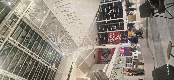 interior of a mall or public building with a high, complex ceiling structure of metal beams and glass. There are stores and crowds of people on the lower level, with visible signage. Seating areas are scattered around. The photo is taken from an angle that emphasizes the height and architectural details of the ceiling.