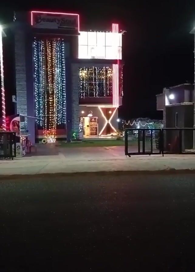 building at night, decorated with lights. The building is labeled "BeautySoul" in red neon lettering at the top. There are strings of lights hanging down the front of the building and an X-shaped light decoration at the entrance. The building appears to be a multistory structure with modern architecture. There are people standing near the entrance, and the area is lit by streetlights. The overall impression is of a festive or celebratory atmosphere. The camera is positioned across the street from the building, providing a full view of the decorated facade.
