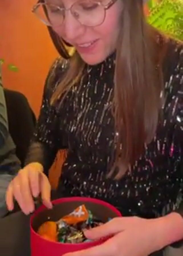A young woman wearing a Santa hat and glasses holds a red container in her lap. She looks at the contents with excitement, taking out wrapped candies. The container is filled with mandarin oranges, candies and other snack items. The person is seated next to another person wearing jeans. The background shows a room with orange walls and decorations.