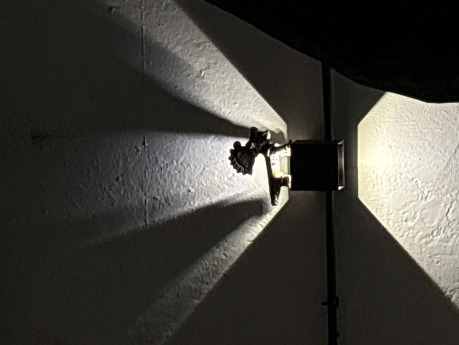 In Mexico City, Mexico, an interior or semi-enclosed architectural scene displays a dark, stylized metal sculpture, approximately 10-15 cm in height, depicting an animal with an elaborate, fan-like back or headpiece. The sculpture is centrally positioned atop a black, rectangular, wall-mounted up-down light fixture. The fixture emits two distinct, bright conical beams of light, one upwards and one downwards, illuminating a textured, light-colored wall with an uneven, stucco-like surface. The upward light beam casts multiple, elongated shadow fingers from the sculpture onto the upper wall. A thin, dark horizontal element, possibly a conduit or railing, traverses the lower portion of the wall below the light fixture. A large, dark, indistinct shape, likely a person's shoulder or arm, occupies the lower right quadrant of the foreground, partially obscuring the scene. The overall environment is dimly lit, emphasizing the illuminated sculpture and its shadows. No discernible human actions or interactions are depicted beyond the implied presence of an observer.