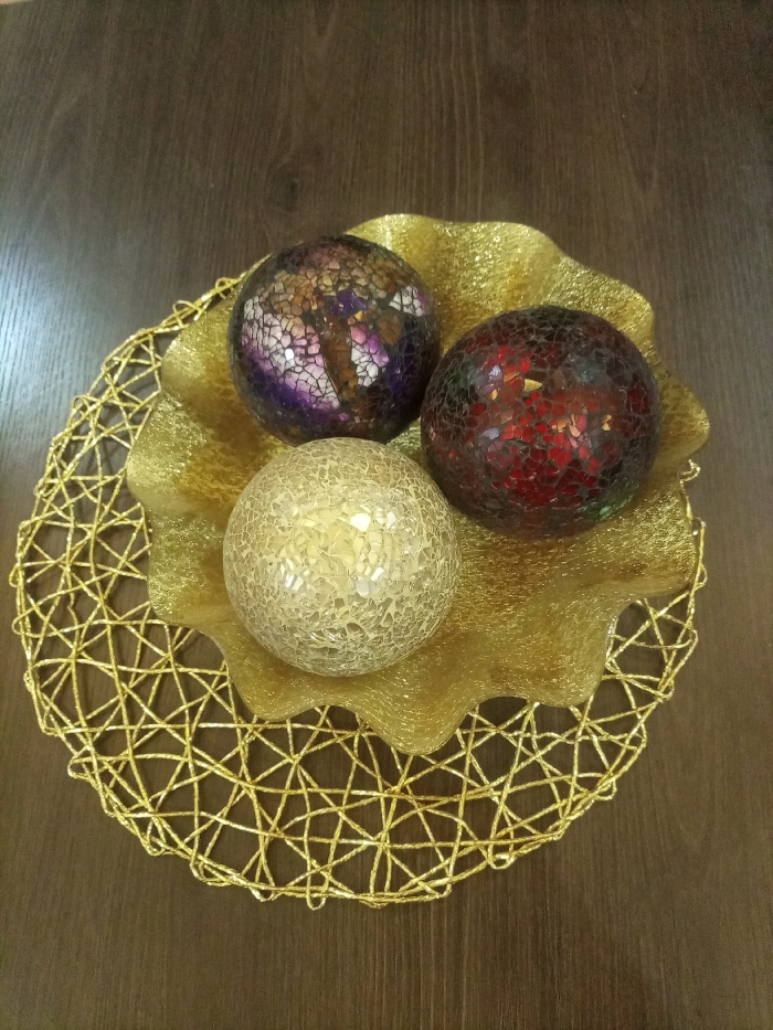 Three mosaic glass spheres, colored gold, purple, and red, rest on a gold ruffled plate
