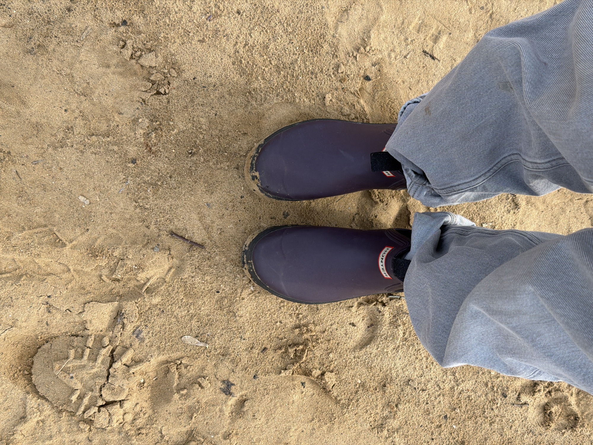 A high-angle photograph depicts a pair of feet clad in dark rubber boots on a sandy surface. The individual is also wearing light grey denim trousers, casually rolled at the ankles. The boots are identified by the visible "Hunter" logo. The sand exhibits variations in texture and color, with some visible footprints and scattered debris like a small twig. No other individuals or objects are present in the scene. The location is not discernible from the visual information, and I cannot state that the image was taken in Malakhovka, Russia.