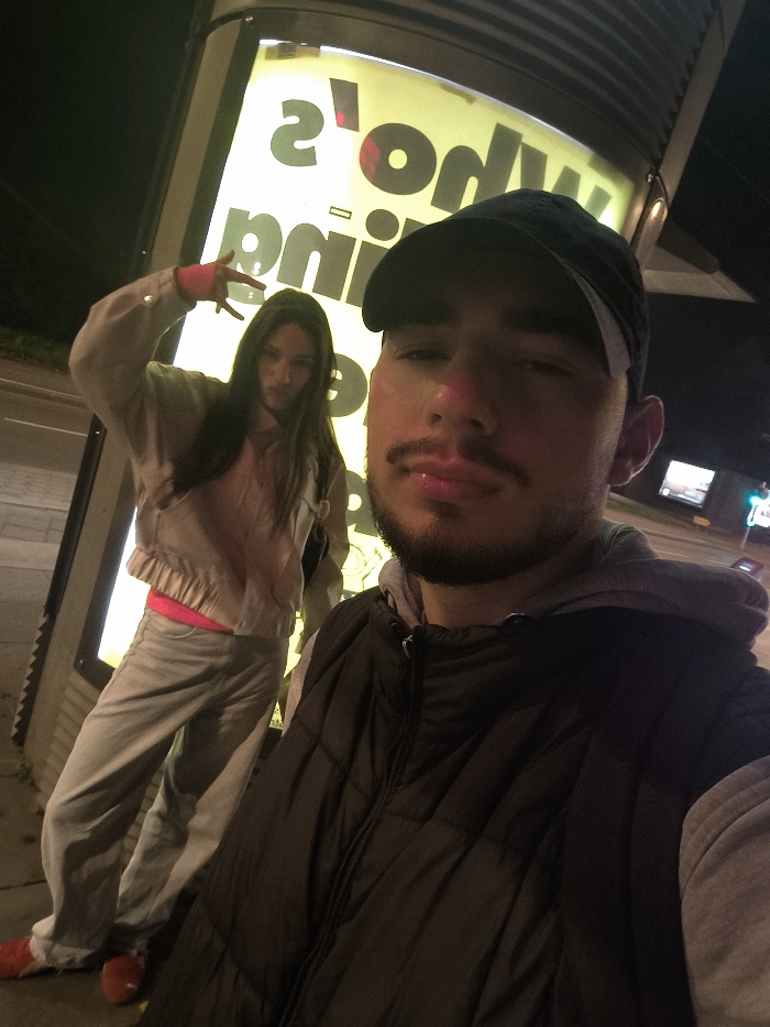 A selfie captures two individuals at night. The man in the foreground wears a dark vest and a black cap. The woman behind him, making a hand gesture, sports a light-colored jacket over a vibrant pink top, along with grey pants and reddish shoes. They stand next to a sign with bright yellow lettering, illuminated against the night sky. Street lights and the outlines of buildings are visible in the background.