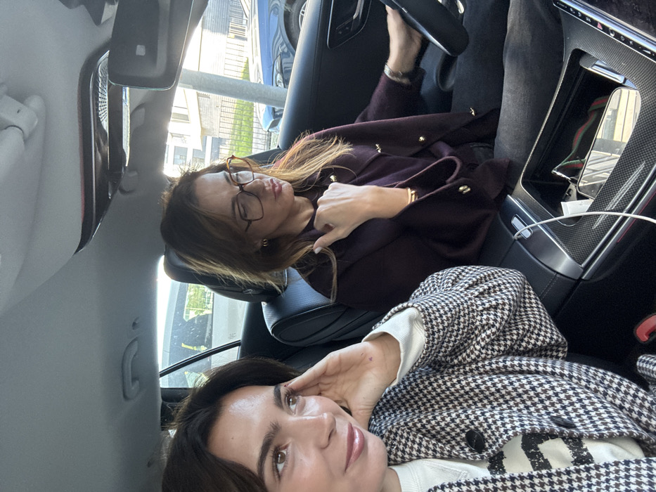 Two adult females are positioned within the interior of a passenger vehicle in Loures, Portugal