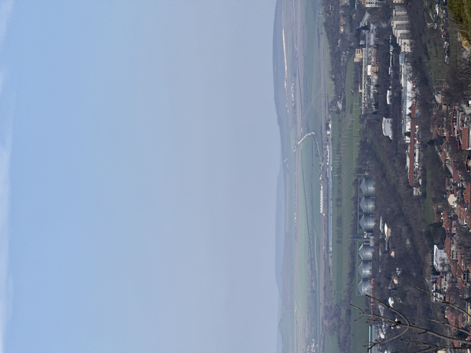 The image displays an elevated panoramic view of the city of Provadia, Bulgaria, and its surrounding landscape under a clear, light blue sky. The upper two-thirds of the frame consist of the sky. The horizon reveals distant, undulating hills with visible patterns of green and brown agricultural fields. A narrow, light-colored path or road extends horizontally across the mid-distance before turning into the hills. In the midground, a prominent industrial or agricultural facility features a cluster of six large, metallic, cylindrical storage silos, light grey in color, positioned on a low rise. Surrounding these silos are other smaller industrial-type buildings. Further to the right in the midground, multiple larger multi-story buildings, possibly apartment blocks or commercial structures, are visible. Green and brown cultivated fields dominate the flatter areas, interspersed with lines of trees, some appearing bare. A linear body of water or canal can be observed horizontally in the mid-distance. The foreground depicts a segment of the city's residential area. Numerous buildings with distinct reddish-orange tiled roofs are visible, closely packed together. Bare tree branches obscure the lower left corner of the frame. No individuals, specific actions, or interactions are discernible due to the elevated perspective and distance.